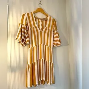 Beautiful fabric, modern on-trend silhouette, playful chunky striped pattern, deep V neckline, tiered A-line & billowy sleeves. Perfect for dressing up or down for a knock-out outfit!