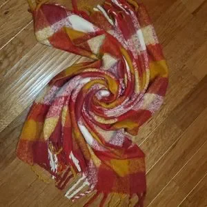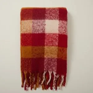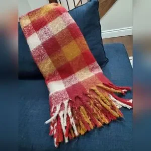 Oversized checkered pattern with chunky fringe on both ends. 0.75" H × 50" W × 60" L. Like new condition.