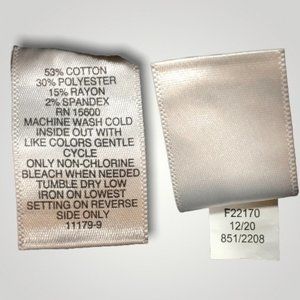 - 53% Cotton, 30% Polyester, 15% Rayon, 2% Spandex