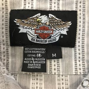 Men’s, Official Harley Davidson, 100% Cotton, Legendary Motorcycles Skull Logo, Bone n Grey, short sleeve, button down shirt. Broken in but in very good comfortable condition.