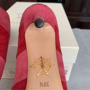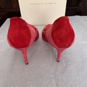 Gorgeous Charlotte Olympia Desiree in Stripes Suede 3.5 ' Heels in Rouge/Dark Pink SZ 8.5 or EU 38.5. Signature gold web plaque at sole. Comes with original box, dust bag.