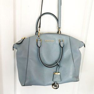 Up for sale is the Michael Kors Leather Satchel Bag, Light Blue, used only a couple of times and in EXCELLENT condition. Great for casual or semi-formal use.