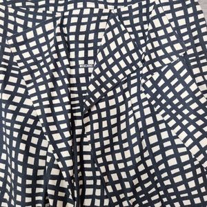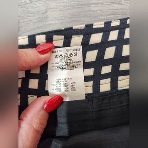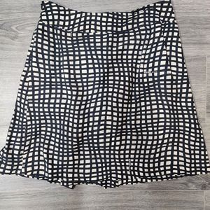 Nice cream and black skirt with a neat design in the front w the ruffles. Side zip. Fully lined. Good Condition. Waist approx 15 inches and total length approx 21 inches. Please see pics for care and material content .