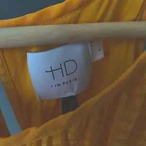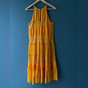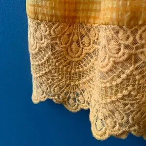 Really pretty mid length HD in Paris dress from Anthropologie. The sunniest marigold lightweight poly-blend mini plaid with tonal cotton lace and ruffle inserts down the flared A-line shape. High neckline with single button close at back of neck. Rayon lined for comfort and slips overhead to get out the door in 30 seconds for the beach or a breezy walk. Ready for your warm weather adventures, summer or winter vacation, Villanelle is there with you! Questions welcomed!!