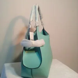 NWT, authentic Kate Spade leather bag in Caribbean blue. 18 x 17 1/2 x 6". Authentic dust bag included.