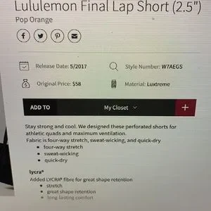 Lululemon Final Lap Short 2.5” - Pop Orange Sz 4