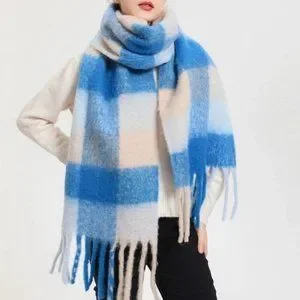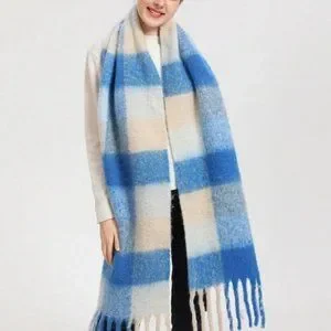 BLUE plaid fringe trim scarf fall fun contemporary multicolor