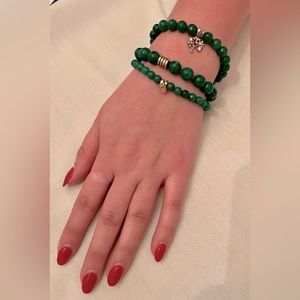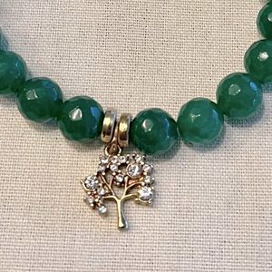 The second bracelet hosts a rhinestone embellished “tree of life” charm, flanked with two gold plated bands. The opposite end of this bracelet is detailed with a gold plated, rhinestone trimmed band. This bracelet encompasses 18 (medium sized) jade beads around, in between the 2 charms.