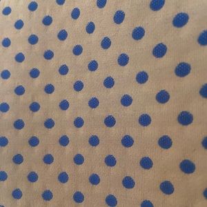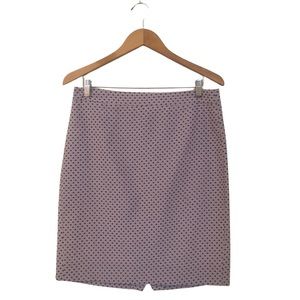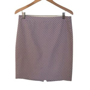 Grey twill background with jacquard royal blue small scale polka dots. Classic pencil skirt construction, back zipper closure, back slit, fully lined. Excellent pre loved condition- no signs of wear.
