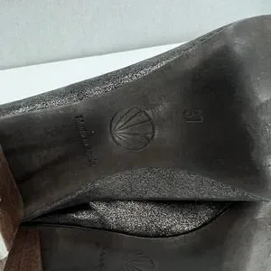 Never worn outside, may be a floor model, Minor rub wear in a heel area, small scratches on the wood, no wear to soles or heels-see photos