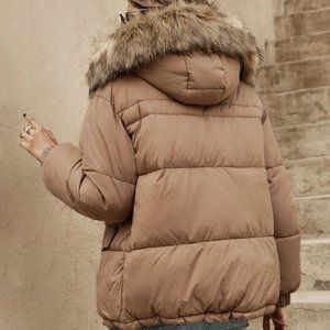 Tan Preppy Womens Flap Pocket faux fur Hooded Puffer Coat