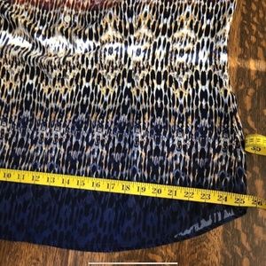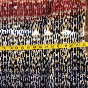 Beautiful and silky-like cabi blouse; it’s multicolored but more like a rainbow with light colors descending to dark blue. It can be casual or dressy with a nice blazer. This is an X-Large shirt that can fit a large as well.