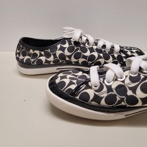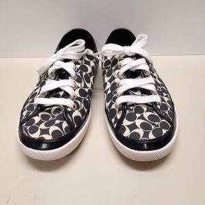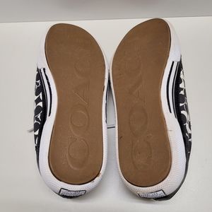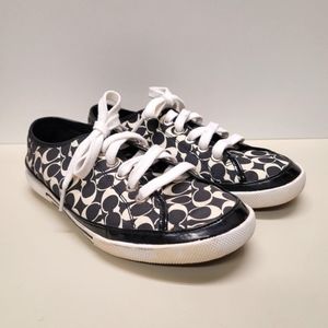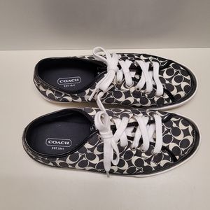 Coach monogram sneakers. A little big for me. Super clean. Excellent pre-owned condition. The white shoe laces have been washed but still have normal light stains from going through the grommets. Size is 7.5
