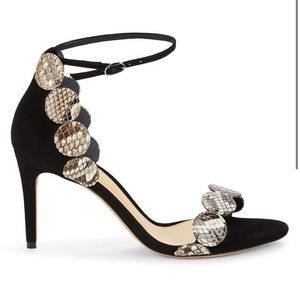 Suede sandal with a slim ankle strap and circle exotic python leather trim.