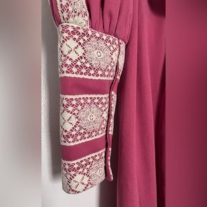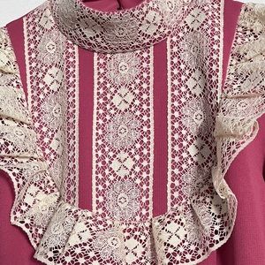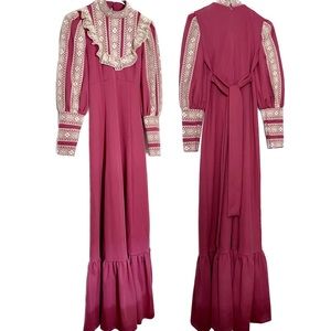 Vintage 70s Pink Prairie Cottage Lace Bib Long-sleeved Dress