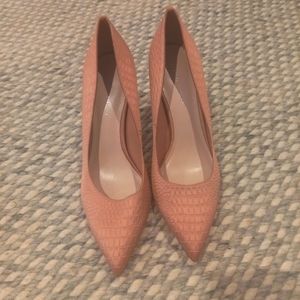 Charles and keith heels salmon satin crocodile embellished. scuffed on right shoe outstep.