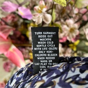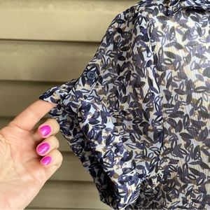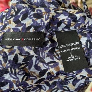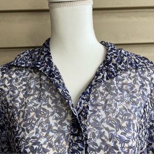 This is a light and airy sheer tunic from New York & Company, ladies size Large. The crinkly fabric, 100% polyester, is white, with a small, leafy pattern in black, navy, brown, and cream. Features short, button detail sleeves, collar, and one-quarter button placket. So versatile - pair it with leggings and camisole, or over a slip dress!