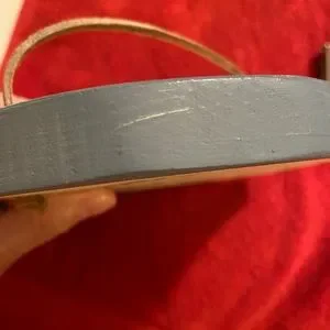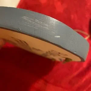 Due to age & being created by hand, there are some paint marks & scuffs to the piece. Not really noticeable when hung. Attached leather cord for hanging.