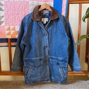 Love vintage denim chore coat by St. John’s Bay. Perfect fading, blue flannel lining and brown corduroy collar and cuffs. There’s a hole in the lining above brand tag inside and some mismatched buttons. Great condition overall! Tagged size M petite and arms are on the shorter size.