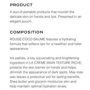 A duo of portable products that nourish the delicate skin on hands and lips. Presented in an elegant pouch.