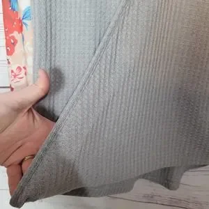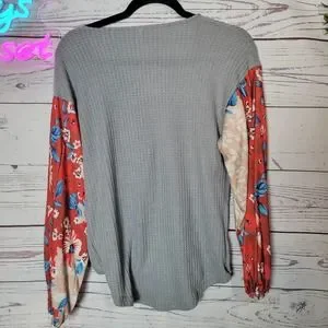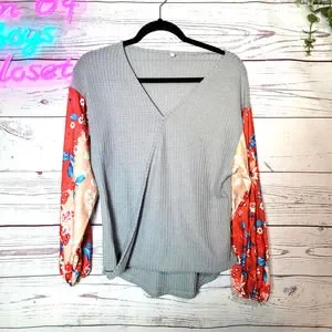 Boutique Gray Floral Sleeve Boho Waffle Knit V-Neck Pullover Sweater Woman Small