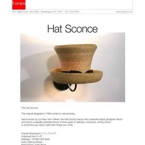 This unique Hat Sconce is a classic whimsical wall mount fixture design by NYC milliner Marta Baumiller. The Hat Sconce features natural straw braid surrounded by a stylish black grosgrain ribbon. The satin black armature and brass pullchain switch top it off.
