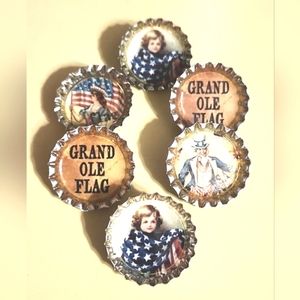 Set of 6 patriotic bottle cap pins from Anthropologie. All done with a beautifully nostalgic feel in silver hardware. There are 2 duplicate pins in the set... the Grand Ole Flag and little girl draped in flag.