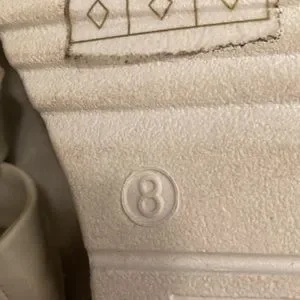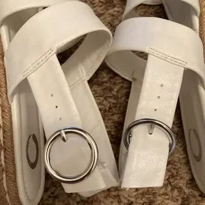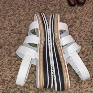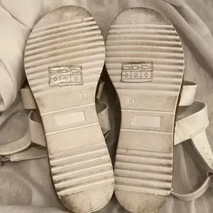 Sandals are used once in good condition, uppers are pristine but soles show signs of wear, buckle closure, row of roping on sides, looks great with capris, great loved condition