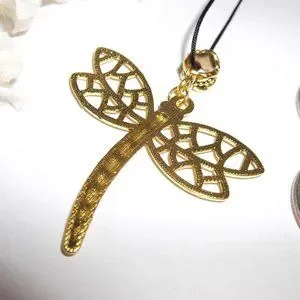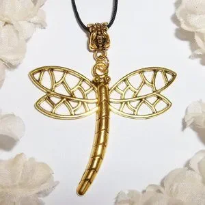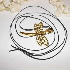 This golden statement dragon fly necklace set is brand new & handmade by me - wvluckygirl. Done with a gold toned costume jewelry charm that was antiqued in black. Pendant and decorative bail measure 2 inches tall & 1 3/4 inches wide. It slides on or off of a 36" black nylon braided rope cord string. It is adjustable in that you can tie it to any length u want 2 wear it. You can double it up around your neck and wear it as a layered look short choker. Leave it long and wear it as a trendy stacking necklace. You could even change up your look by adding the pendant to a gold chain you already own. Very versatile set. Buy it now before someone else does!