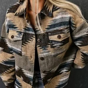 New blue distressed Aztec print shacket