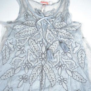 The perfect mini dress for any occasion featured in a semi-sheer, bead-adorned fabrication with front tie detail and exaggerated bottom hemline for added shape.