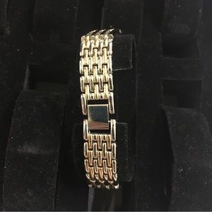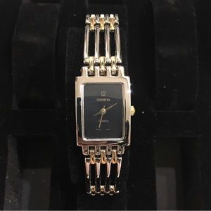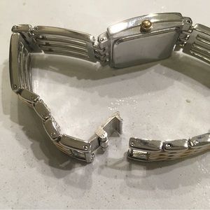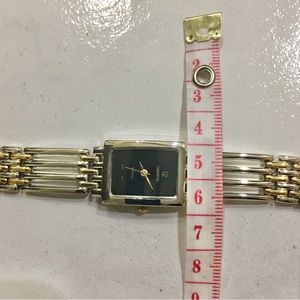 Never used. Metal strap can be adjusted in a watch supply shop to fit your size. It needs batteries (not supplied by seller). Gold and silver tones with black dial background. Measuring tape used in photos is by centimeters (cm)