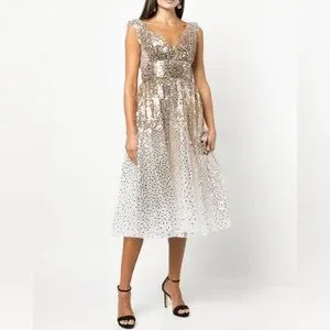 Gorgeous Sparkly Marchesa Notte Gold Sequin V Neck Midi Dress Size 4 NWT Luxury