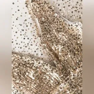 Reverse ombré gold at top Sequins sewn in create a dreamy cascade of sparkling shine! Guaranteed to be a beautiful stand out piece belle of the ball look! Flattering silhouette v neck top and flared skirt!