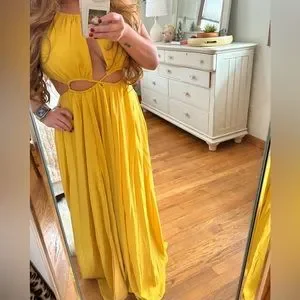 Never worn brand new! Gold maxi dress with cut outs and gold coin hardware. Size Xs. Too long for me I’m 5’1” super beautiful dress. Flowy and comfy. Cut outs on front and back. Super pretty with just the right amounts of skin showing