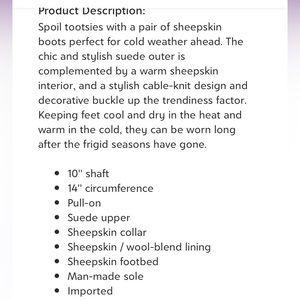 Spoil tootsies with a pair of sheepskin boots perfect for cold weather ahead. The chic and stylish suede outer is complemented by a warm sheepskin interior, and a stylish cable-knit design and decorative buckle up the trendiness factor. Keeping feet cool and dry in the heat and warm in the cold, they can be worn long after the frigid seasons have gone.