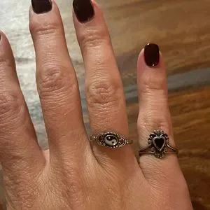 Two silver costume rings. One has the yin and yang symbol and the other reminds me of a fleur de lis.