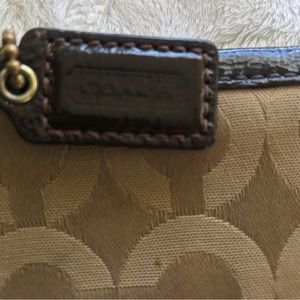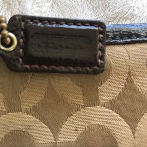 Coach Signature Madison Op Art Featuring dark mahogany/dark brown patent leather panel and strap, gold color coated metal Coach signature stagecoach logo, and tan/cream Op Art sateen jacquard fabric. Op Art sateen jacquard fabric with leather trim Inside open pocket Zip-top closure, fabric lining Strap with clip to form a wrist strap or top handle 9 1/4" (L) x 5 1/4" (H)