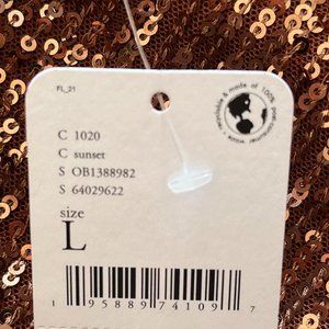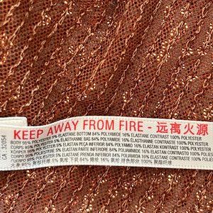 Size: Large. Color: Sunset. Shell: 95% polyester; 5% elastane. Bottom: 84% polyamide; 16% elastane. Contrast: 100% polyester. Double snap closure. Non-adjustable straps with suede-like feel.