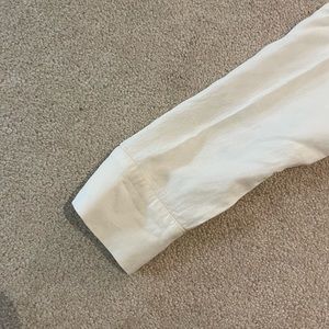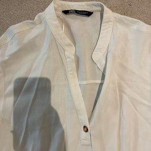 This is a white Zara linen dress in a size medium! It is midi length! The rope detailing around the belt cinches you in. Worn gently a few times!