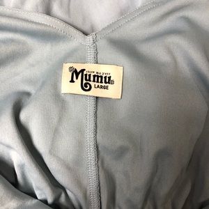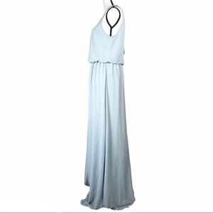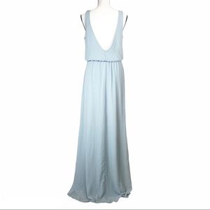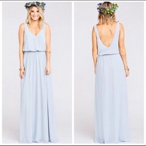 New without tag Show me Your Mumu Kendall bridesmaid maxi dress in steel blue. Size large. Soft v-neck with low back. No slits. Lined to the ground, and elastic waist. Very minor stain and pull- see last 3 pictures. Barely noticeable. Pit to pit 18.5, pit to bottom 56
