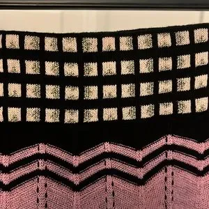 Colors are burgundy, black, pink, cream and yellow. Waistband is metallic black and pink grid. Very cute!!