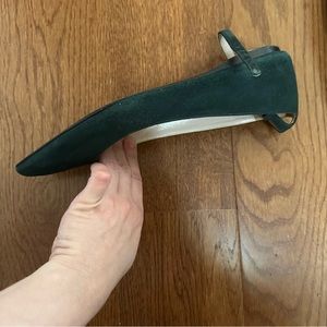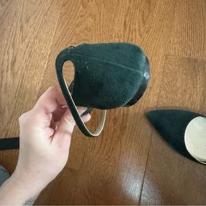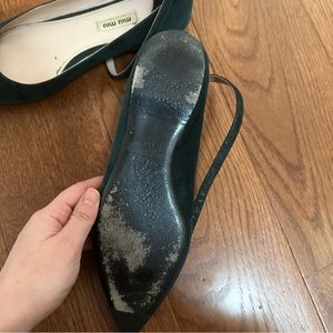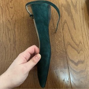 Forest green pointed toe flats from Miu Miu, in size 38.5. I’ve worn these a handful of times and there are color variations in the suede, but overall, these have plenty of life left in them and are a classy pair of shoes, perfect for the office or for a night out, and are comfortable too. I am a size 8-8.5 and these fit me fine.