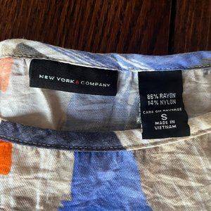 New York & Company short-sleeve shift dress with blue, orange, black, and tan print and front pocket. Missing belt, but still cute without it or you could pair it with your favorite belt. Excellent pre-owned condition.