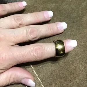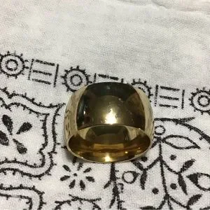 Gold-tone domed band. 12mm wide. Made of 316L stainless. Worn only a few times. A tad too wide for me but very comfortable to wear. Size 7 but fits more like an 8 in my opinion. Great ring.