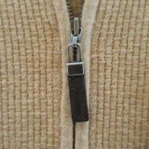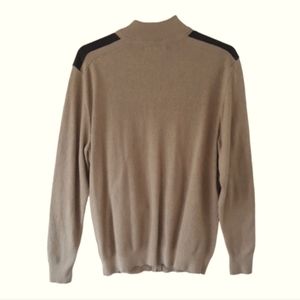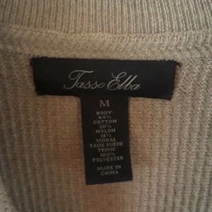 Style: Tasso Elba sweater full zip jacket; ribbed basket weave texture; 2 hand pockets; quilted inner; faux suede on shoulders and pockets; mock neck and full zip closure, leather zipper pull; tan & brown color