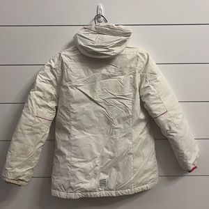 Super cool girls Lands End ski jacket. Size L. White with a grey fleece hood and cute pink stitching! Worn but still has a lot of life left in it!
