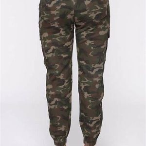 Camo full stretch, knit fabric, elastic waistband, front closure, elastic cuff at ankle, 6 pocket detail. Oversized fit (not on me) too small for me.