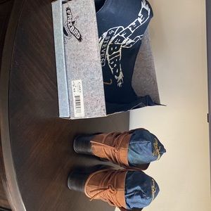 These boots were worn twice. Excellent like-new condition! All leather. These are designed to have a “worn”, rustic look, so imperfections are part of the design. This style is always sold-out, and hard to find! Already have too many boots, so didn’t really wear these, and hate to see them sit in my closet. Gorgeous on, and very comfy slip-in style!! Comes with original inserts and box for storage.