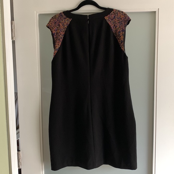 Black and fully lined with festive cap sleeves. Size 12. Very festive!